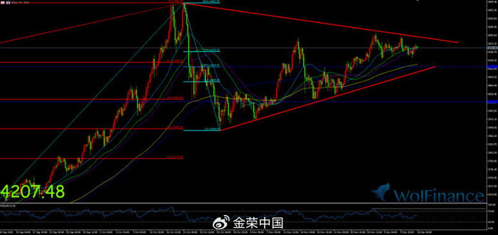 国际黄金周二触底反弹震荡收涨,周二早间金价延续短线自418一线震荡走高,亚盘时段金价维持震荡走势最高上探4198一线后震荡回落,进入下午盘金价扩大日内跌幅最低下探4170一线后上演短线触底V型反转走势,欧盘时段金价维持短线上周走势一度加速上探4212一线后小幅回落,美盘开盘前后金价震荡走低,美盘时段金价扩大短线回落最低下探4189一线后再度走高,周三凌晨金价最高上探4221一线后扩大回落回踩4201,周三凌晨金价反弹企稳收盘于4210一线。日线录得影线较长小幅阳线,连续7个交易日录得小幅K线,当前金价收盘于日线10日均线支撑位价格上方,维持日线级别偏多指引参考。小时级别显示,短期金价触底反弹再度形成对小时级别均线向上突破走势,当前金价逐步企稳于小时级别均线支撑位价格上方,带来小时级别均线向上交叉发散排列,维持短期底部反转偏多指引参考。四小时级别移动平均线呈粘合收窄表现,当前金价处于均线支撑位价格上方,维持四小时级别偏多震荡指引参考。美联储利率决议公布在即,金价触底反弹重返高位或继续加剧偏多震荡走势,日内谨慎维持逢低多交易思路。